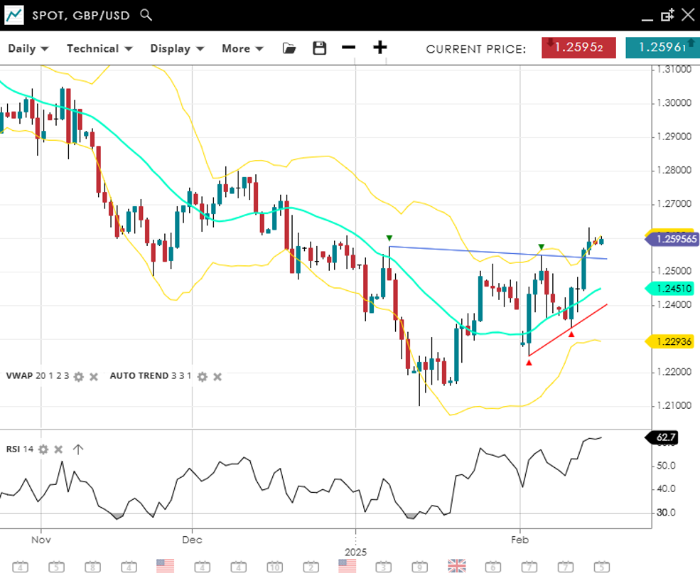 GBP/USD has also turned into a more neutral phase, trading at 1.2411, marginally above its VWAP (20) of 1.2379. Key support is found at 1.2109, while resistance stands at 1.2567. With RSI at 50, there is little momentum for a move either way.