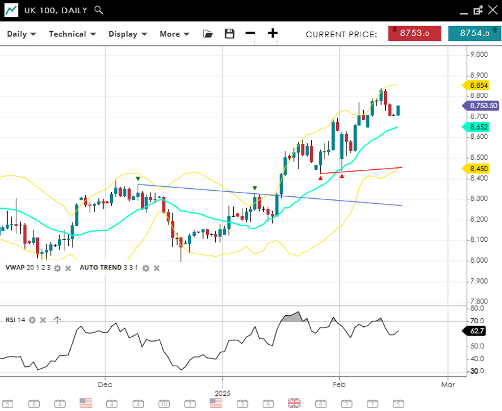 Germany 40 maintains its bullish momentum, currently trading at 21,740, well above its VWAP (20) of 21,399. The trend remains positive, with support at 20,825 and resistance at 21,974. An RSI reading of 66 signals sustained strength, though a third bearish RSI divergence is a sign a larger correction to the trend could be coming.
