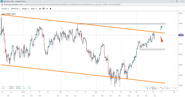 Wall Street paused at the round 34k level but continued its upward move after completing a flag pattern at 33330. Bulls might fail to get past the descending channel trendline, forming a temporary top, but doing so will expose 34520. If 33575 gives way to bears, we might see a deeper slide towards 33270.