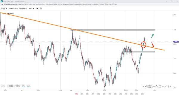 After retesting the bearish trendline around $24.80/oz, silver shows signs of a long-term trend change. If bulls fail to capture the resistance of $27.50/oz, prices might retrace back towards the channel and even fall down to $23.50/oz. On the other hand, the upside leg could extend as high as $30/oz if bullish momentum rises.