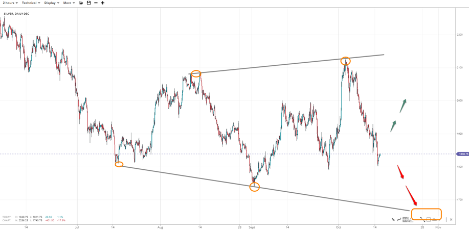 EUR/GBP is at risk of further downside below 0.8700 as chances of a broadening descending wedge increase below the upper trendline. 0.8700 is minor resistance bulls must overtake, and 0.8870 is below 0.9900. Another low is probable as the range of the last leg should be larger than its preceding. This brings 0.8225 into the spotlight if 0.8500 is lost.