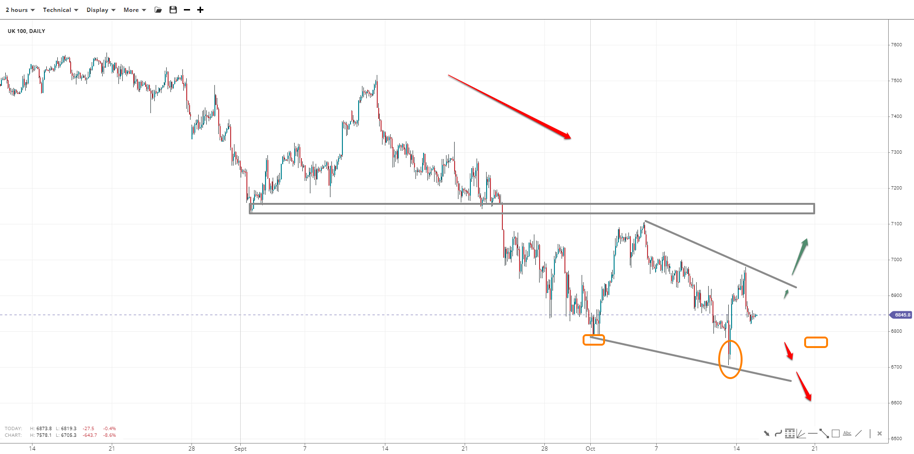 UK 100 failed to recapture the 7000 handle as the 6700 bounce lacked momentum. Below the swing high of 6980, price action resembles a falling wedge, with 6700 and 6600 back on the radar unless an inverse head-and-shoulder forms support at 6800. 7150 is key resistance above 7000 and 7100.