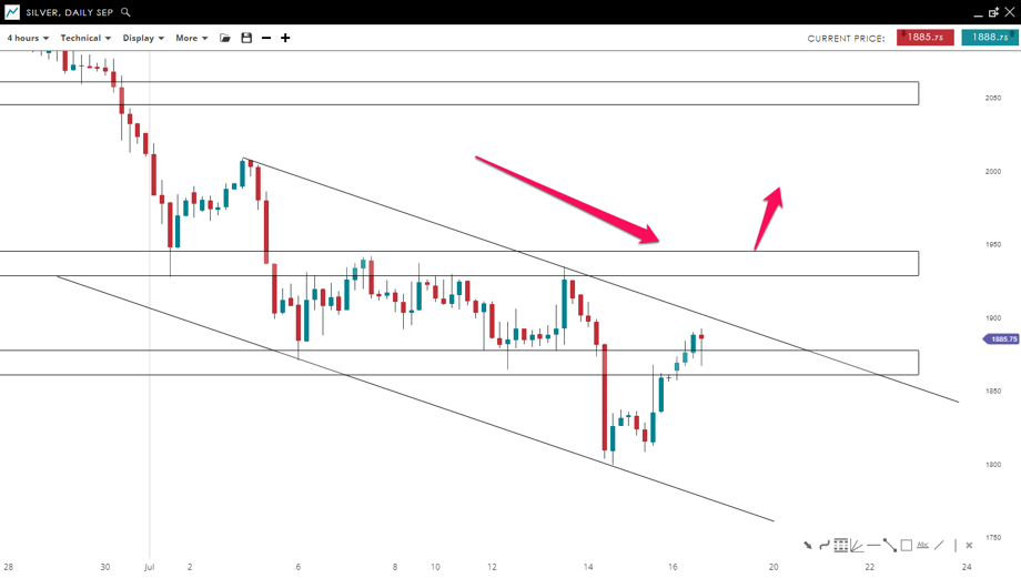 The price of “Silver” is bouncing inside a bearish channel formation where lower highs and lows have been posted. The market currently is trying to reverse higher but it might encounter an area of confluence made by the resistance level formed by the July 7-14 peaks near the 1,935 mark. If the price closes and breaks the 1,935 mark then silver could trade back towards the 2,055 mark.