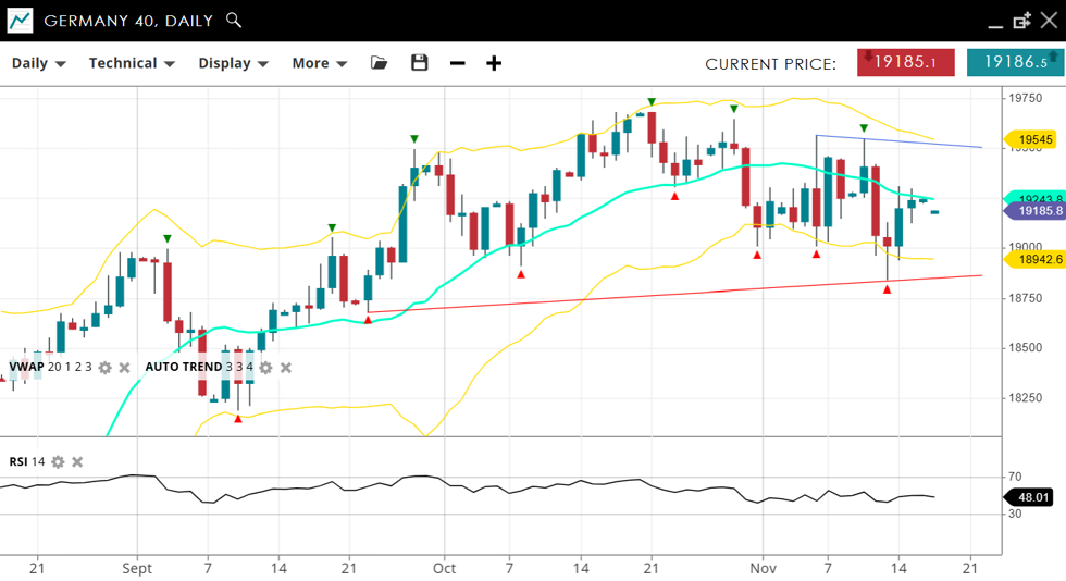 Germany 40 remains bullish but is still in a correction phase, trading at 19,185, slightly below the VWAP (20) level of 19,243 after showing weakness recently. Support sits at 18,942.6, with resistance at 19,545. The RSI is at 48, indicating moderate momentum as the index attempts to regain strength within its broader uptrend.