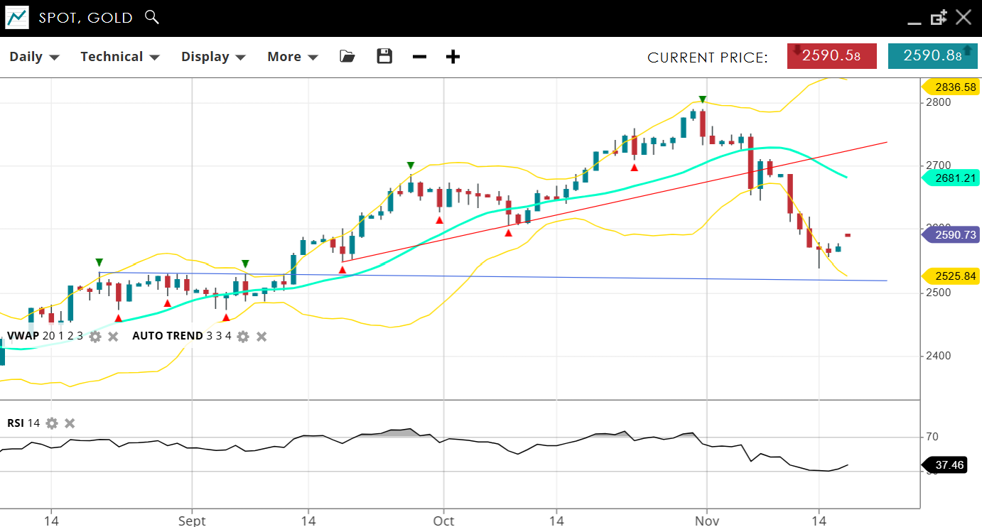 Gold exhibits bullish tendencies overall but is in a sharp correction phase. The price is at 2,590, below the VWAP (20) of 2,681, and approaching the support level of 2,525.8. Resistance is at 2,836. The RSI at 37 reflects new bearish sentiment, marking a significant shift after months of bullish momentum.