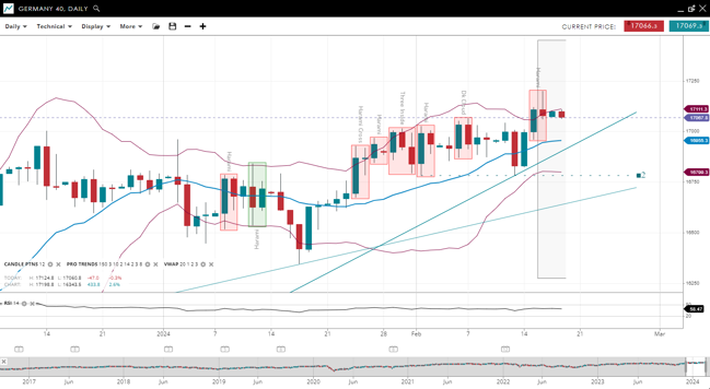 Wall Street is in an impulsive phase of a bullish trend, highlighted by its price above the upwards-sloping 20-period VWAP of 38,482. The support for this index is at 38,064, with resistance at 38,900. The RSI is at 57, indicating positive momentum.
