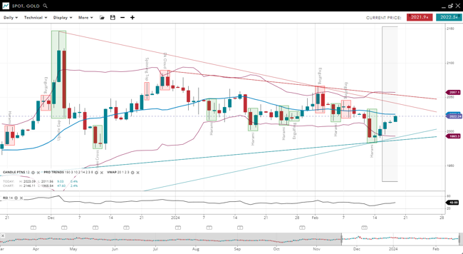 Gold is in the corrective phase of a bearish trend, with its price just below the down-sloping 20-period VWAP of 2,025 but close to it. The support level is at 1,993, with resistance at 2,057. The RSI at 49 indicates a neutral to bearish momentum, suggesting the market is assessing direction.