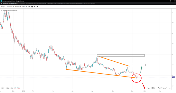 The stock seems it has put in a falling wedge at 0.85 with chances of reversal rising. 1.45 and 1.90 are major medium-term swing highs bulls need to regain control for a chance at higher levels. On the other hand, breaching the low might lead to the 0.50 handle, being round support.