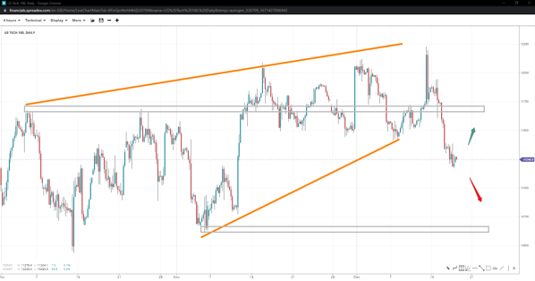 Following up on last week’s rising wedge pattern, US Tech slid towards the 11k handle and experienced some relief. 11400 is short-term resistance below 11700, with a break of the 11k floor opening the door to 10770.