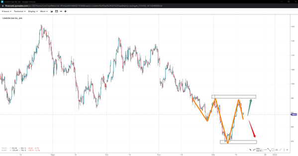 London gas is near completing a potential inverse head-and-shoulders pattern, with the right shoulder expected at 870. In case of a further slope, the door to the 800 floor opens up again unless 850 offers reversal or some sort of respite. With chances of the RS being completed elevated, 965 and the 1000 handle might come sooner than expected.