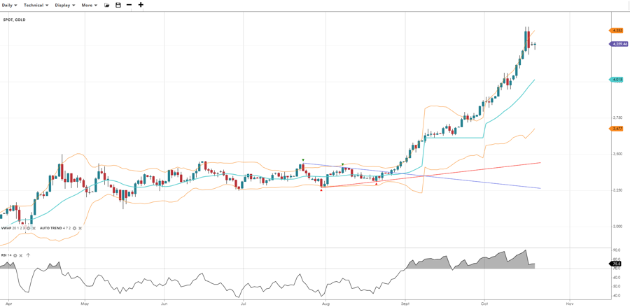 Gold extends its bullish run in a strong impulsive phase, trading at 4,259, significantly above the VWAP of 4,015 but down a bit from all time highs. The RSI at 75.5 signals less overbought conditions. Support is way down at 3,677, and resistance is at 4,353.