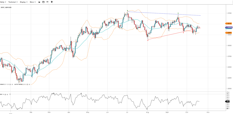 GBP/USD stays in a bullish trend but is correcting sideways, trading at 1.3423, slightly above the VWAP of 1.3400. RSI at 49.8 shows consolidation. Support is at 1.3299, with resistance at 1.3514.