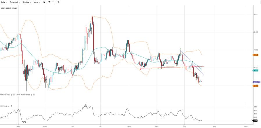 Brent Crude is turning bearish within its broader range. Price has fallen to 6,094, below the VWAP of 6,422. RSI at 30.9 indicates strongly bearish momentum. Support sits at 5,983, while resistance is at 6,860.