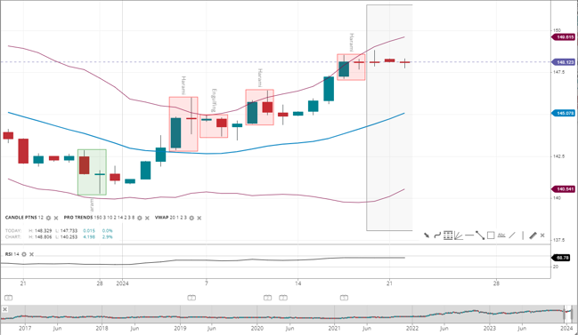 USD/JPY is bullish, with the price hugging the upper 2 standard deviation band above the 20-period VWAP of 145.07. Support is established at 140.54, and resistance is at 149.61. The RSI is high at 68, suggesting strong bullish momentum.