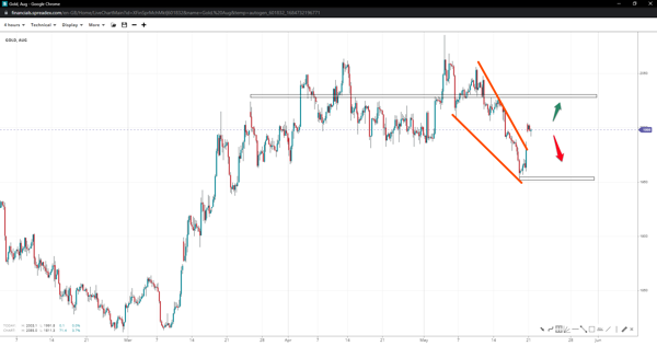 Gold tumbled toward $1950 last week, breaking below the triangle low and paving the way toward 1915 next. If bears hold their grip on the back of a flag or pennant correction, a short-term leg above the 2k handle might drive prices as high as 2030.