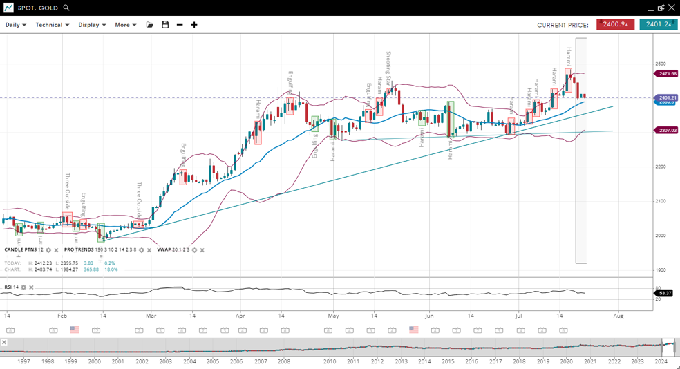 Gold remains in a neutral trend and is in a consolidation phase, with the price steady at 2,401, just above the VWAP of 2,389. Support has adjusted lower to 2,307, while resistance has increased to 2,471. The RSI has decreased to 53, indicating a reduction in momentum.