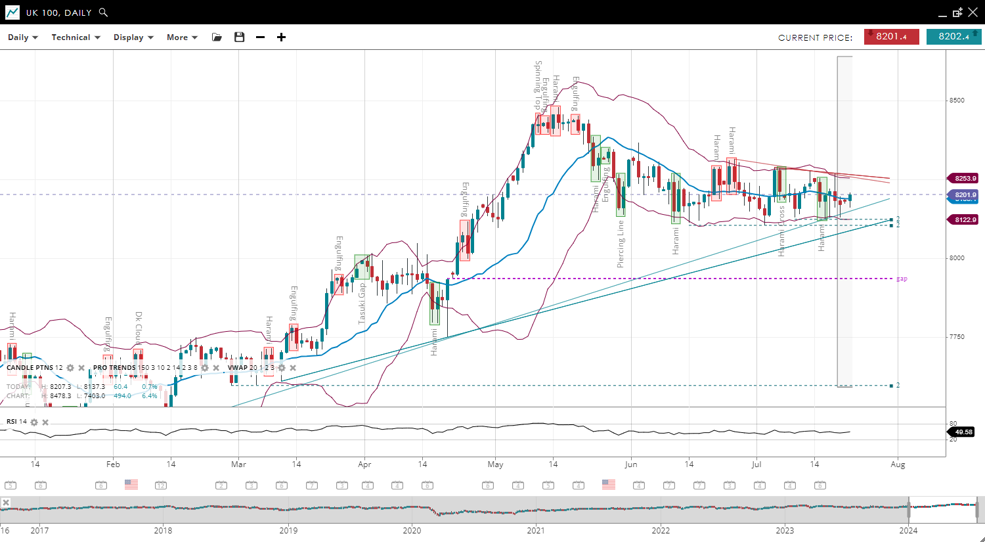 UK 100 remains in a neutral sideways trend and is in a consolidation phase, with the price remaining at 8,201, just above the VWAP of 8,200. Support has adjusted to 8,122, while resistance has decreased to 8,253. The RSI has slightly decreased to 49, reflecting a slight decrease in momentum.