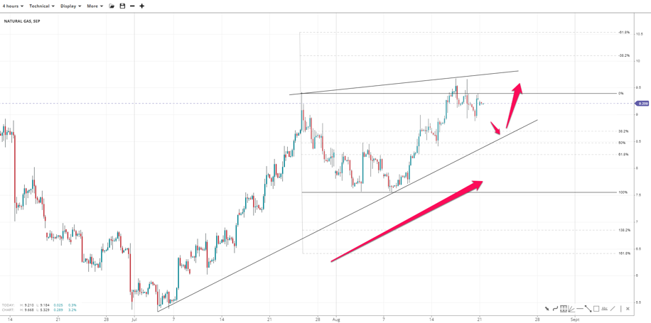 Natural Gas posted a double top after failing to extend to the 10.00 round resistance. The price slid back below 9.50 which has flipped to resistance. If the price continues to fall, the 38.2%-61.80% congestion zone between 8.20-8.70 could offer support and bulls could start to reaccumulate. Otherwise, they might reattempt to capture the resistance at double digits earlier. A close above 10,00 would negate the short-term bear view and might see the price reach all-time highs near 10.50.
