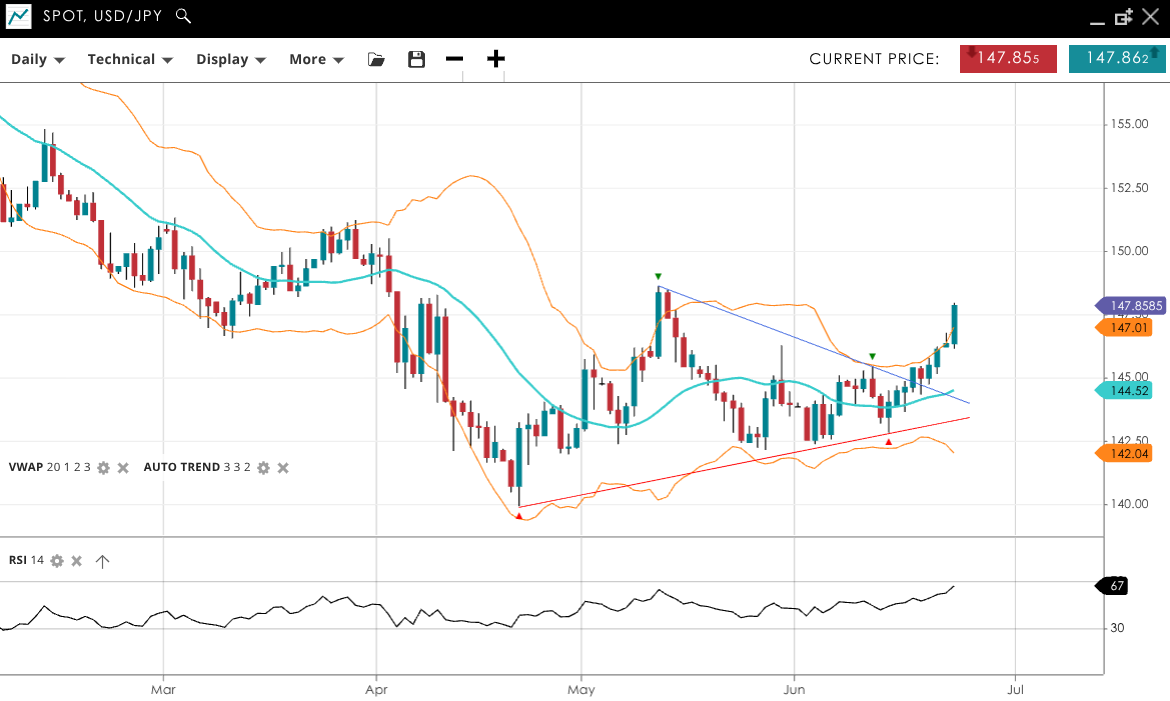 USD/JPY has broken out above a triangle pattern into a bullish impulsive run, trading at 147.86, well above its VWAP of 144.52. RSI at 67 confirms strong buying pressure. Support is at 142.04, and resistance is at 147.01.