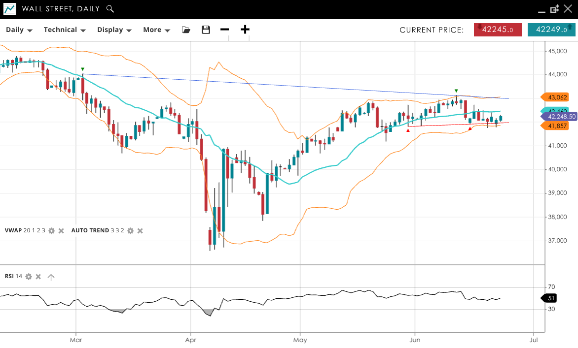 Wall Street continues in its bullish trend but is undergoing a correction. It is trading at 42,249, just under the VWAP at 42,460. The RSI at 51 suggests a neutral outlook. Support is at 41,857, and resistance stands at 43,062.
