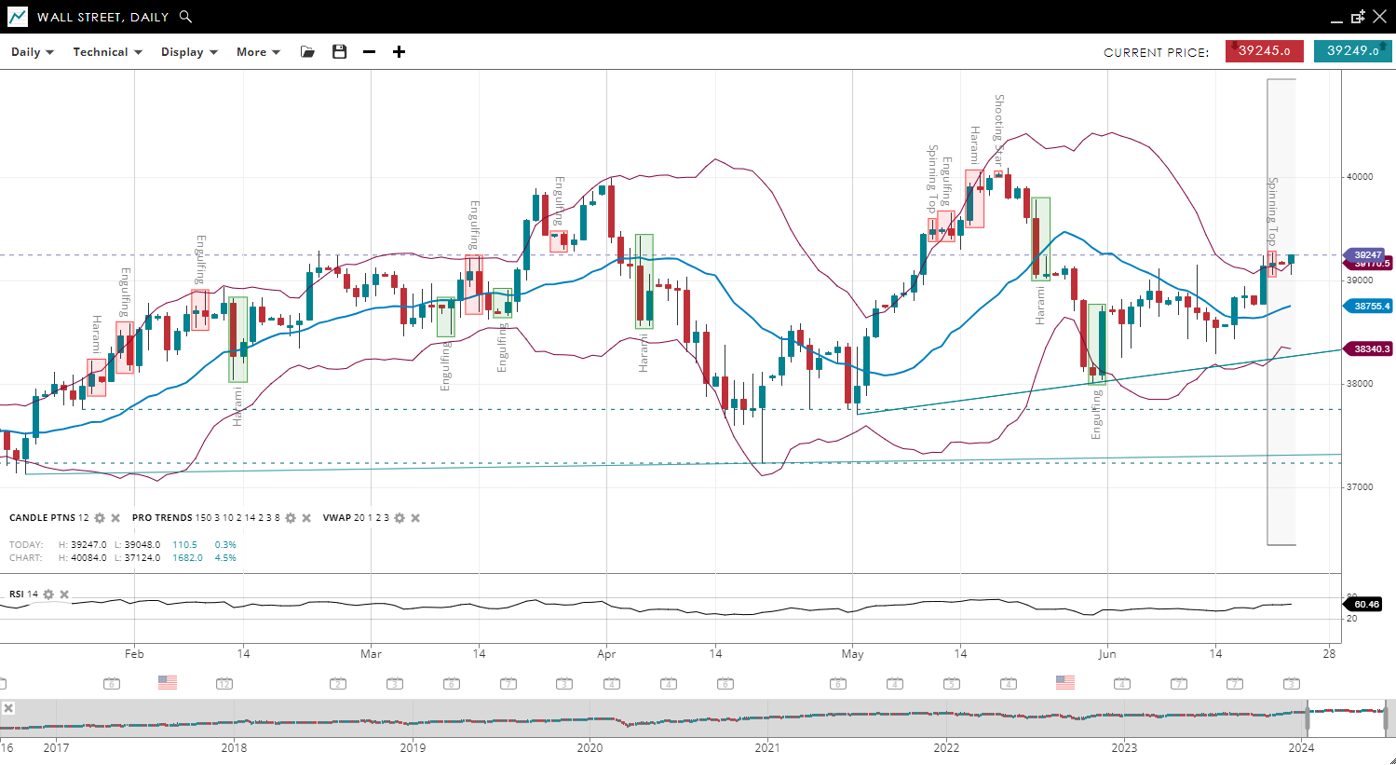 | Wall Street | Bullish | Consolidation | 39247 | 38755 | 38340 | 39170 | 60 |