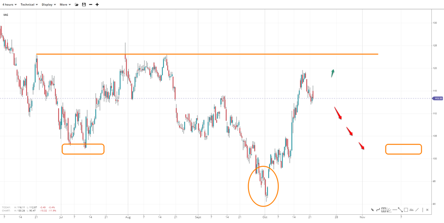 IAG appears to be impelling towards 120.00, with the 123.00-125.00 zone acting as the neckline of a potential inverse head-and-shoulders pattern. The neckline, however, could be sloppy, thus complete. A downside leg towards 102.00 would form the right shoulder, but it needs 111.00 and 105.00 to break first.