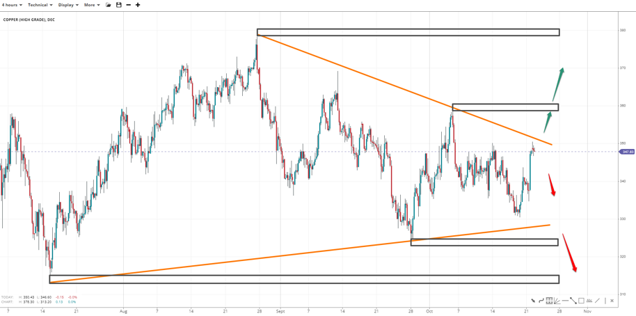 Copper has formed a narrowing sideways market associated with a potential symmetrical triangle. Breaking the 3.25 support will expose the low at 3.10 and 2.50, as this would make the opening range's distance applicable. However, if bulls break past 3.50, 3.60 is major resistance below the high of 3.80.