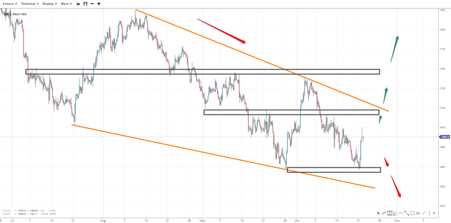 Gold's price action appears to either have completed a falling wedge or be in its last descending leg to completion. If bears lose 1625, the chances of attempting a lower trendline rejection below 1600 will increase. But if bulls recapture 1700, 1750 comes back into the spotlight.