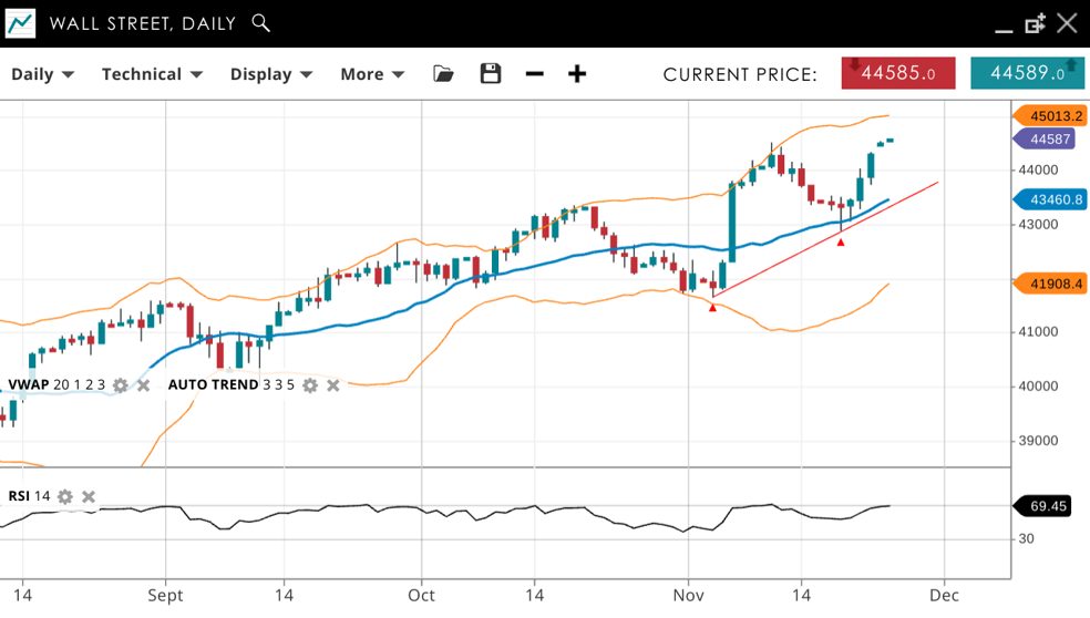 Wall Street remains bullish and is in an impulsive phase, trading at record highs of 44,587, well above the VWAP (20) of 43,460. Support is at 41,908, while resistance is positioned at 45,013. The RSI at 69 signals strong bullish momentum, nearing overbought territory as is to be expected in a strongly bullish environment.