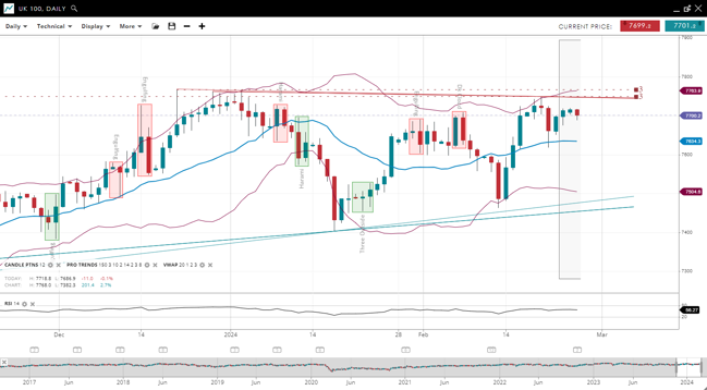 | UK 100 | 7700.2 | Neutral | Consolidation | 7634.3 | 7504.6 | 7763.9 | 56 |
