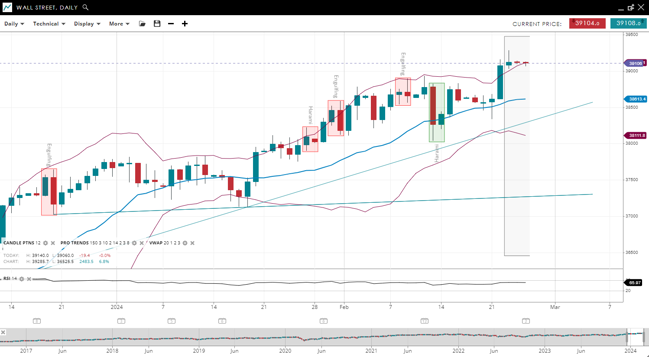 Wall Street is in an impulsive phase of a bullish trend, highlighted by its price above the upwards-sloping 20-period VWAP of 38,613. The support for this index is at 38,111, with resistance at 39,106.1. The RSI is at 65, indicating strong positive momentum.