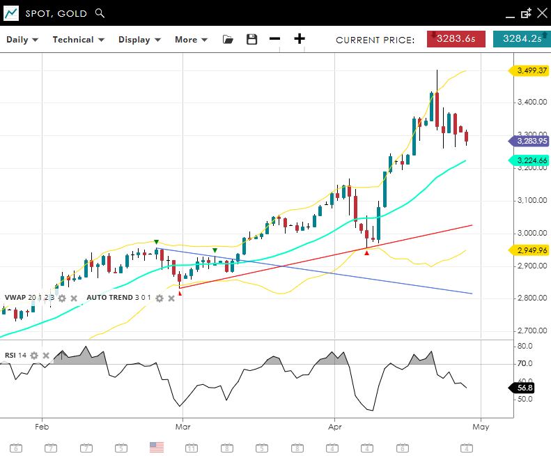 Gold remains in a bullish trend but is correcting. It trades at 3,283, just above its VWAP of 3,224. The RSI has moderated to 56.8, suggesting easing momentum. Support is found at 2,949, with resistance at 3,499.