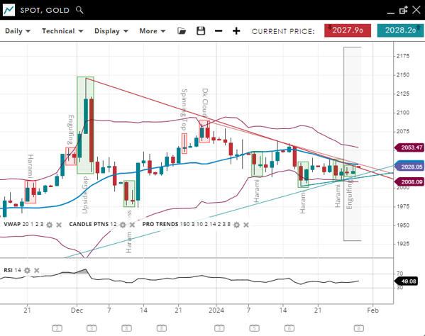 Gold is in a corrective phase of a bearish trend with its price just below the 20-period VWAP of 2,030. The support level is set at 2,007, with resistance at 2,053. The RSI at 48 indicates a neutral momentum, suggesting that the market might be gathering strength for a potential directional move.