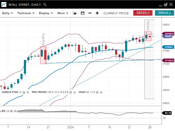 Wall Street is in an impulsive phase of a bullish trend, indicated by its price well above the 20-period VWAP of 37,647. The support for this index is at 37,136, with resistance slightly above the current price at 38,157. The RSI is at 65, pointing towards strong bullish momentum without yet getting overbought.