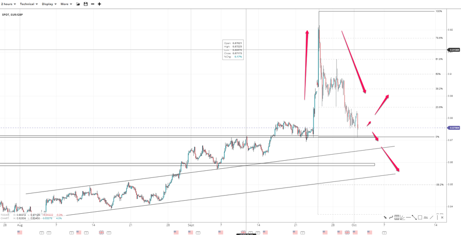 EUR/GBP plunged to 0.8710 after a rally up to 0.9282 as bulls failed to hold the 50% line at 0.9000. The downside leg retested the 0.8710 support with a pullback up to 0.8850 and 0.8932 Fibonacci retracements in the cards. If the support is lost, losses might extend to 0.8600 unless the ascending channel holds prices around 0.8660.