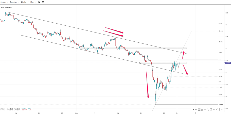 EUR/USD crossed back above the channel and met resistance at 0.9855. 0.9900 and parity remain on the radar, but 0.9860 must give in to get there. If not, a pullback down to the 38.2% Fibonacci retracement of the 0.9535-0.9855 leg at 0.9730 could be seen unless 0.9787 holds firm or bears send the price to the 50% near 0.9700 instead.