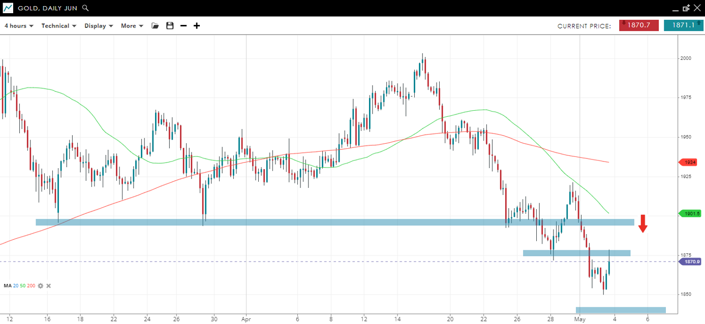 The bias for gold is to the downside while the price remains below resistance from the the April lows at 1890. The recent low at 1875 is interim resistance with a possible downside target based on a measured move of the last big drawdown from 2000 is 1820.