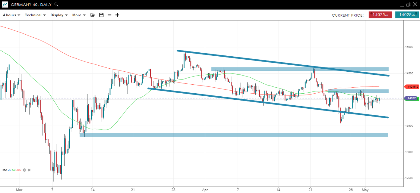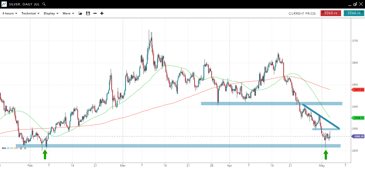 Price has made a higher high and higher low, putting an end to the drawdown from the April 21 high. A break above 7550 would suggest a re-test of the prior high at 7670, while a failure would imply the move up off the lows was corrective and that another test of 7300 is likely.