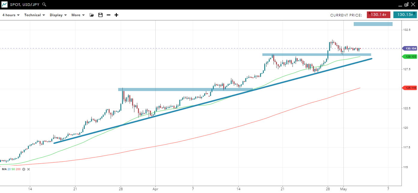 The uptrend remains intact, supported by a rising trendline as well as the 50 SMA. The big 130 level offers one reason for a potential top, or larger pullback but the bias for the pair is still bullish while above 125.