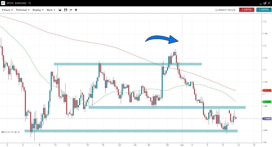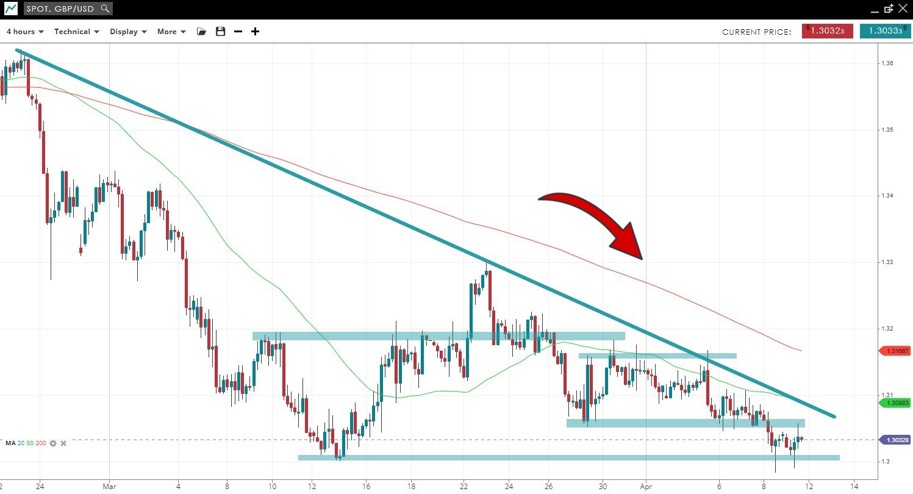 The euro is forming a base again above 1.085 with 1.094 the ceiling to the small consolidation. The trend since late March has been heavily down but the price has held above year-to-date lows. There may be some sope for a short-covering rally with the 200 SMA as dynamic resistance.