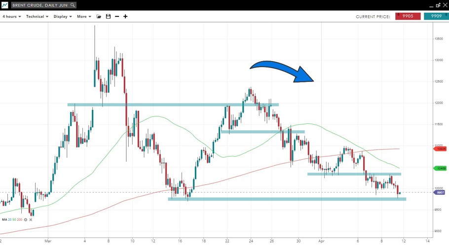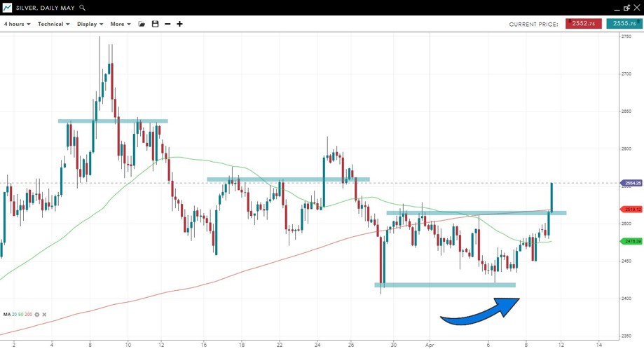 Platinum saw a strong reversal off its year-to-date lows and managed to close above the previous low formed on March 28. A break above the downtrend line connecting the recent highs could confirm that the low is in.