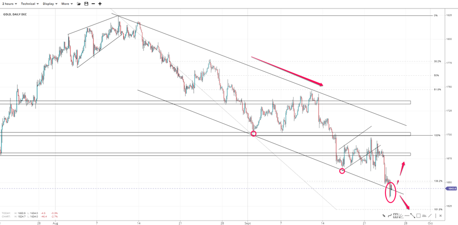 Gold broke outside the flag and below the 138.2% Fibonacci of 1825-1700 near 1650, paving the way to 1620 and the round 1600. The channel-bottom rejection might offer a rally towards 1680 if the swing of 1660 gives in. Otherwise, a range could form.